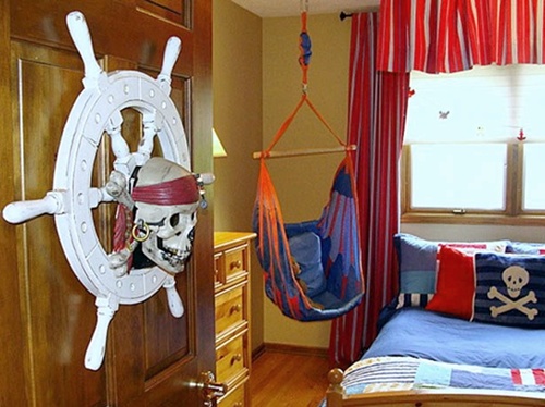 комната любителя путешествий - приключенческая тематика в этом возрасте очень популярна, а детали для такой комнаты, необычные решения можно найти даже в обычном гипермаркете, выезжая за покупками (пляжный мяч, искусственная пальма, размещенная под потолком, гамак);
