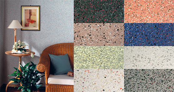Флоки или же «чипсы» – множество мельчайших кусочков из акриловой краски, которые наносят на стену, колонны, двери или карнизы при помощи набрызгивания распылителем. В результате образуется особенная цветовая гамма на поверхности, которая приобретает оригинальную современную фактуру и повышенную прочность. Другое же преимущество этого покрытия заключается в отсутствии потребности тщательного выравнивания стен, так как плотная консистенция состава помогает скрыть неровности и трещинки на стенах. Отличительной особенностью также является и водостойкость, что дает возможность воспользоваться флоковым покрытием в зонах с повышенной влажностью (ванная комната или кухня). Но следует учесть, что поверхность не должна намокать изнутри, иначе декоративный слой может «вспучиться». Самым лучшим решением может стать отделка флоковым покрытием проходных зон, где смесь разноцветных частичек визуально скрывает загрязнения, а сами стены можно мыть не просто водой, но и чистящими средствами. Также это покрытие устойчиво к выгоранию, истиранию, царапинам и быстрому разрушению (износу).